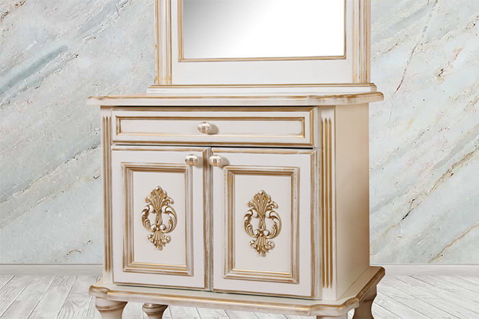 Мебель изготовлена из массива твёрдых пород дерева (дуб, бук). Изделия выполнены из качественного сушёного материала и покрашены в три слоя. Для покраски используются высококачественные двухкомпонентные лакокрасочные материалы итальянских и германских производителей. ЛКП очень долговечное и не требует дополнительного ухода. Обратная сторона зеркал защищена прочной плёнкой. Мебель белого цвета изготавливается из бука, каштанового из дуба. Мы предоставляем возможность индивидуального подбора цвета всех изделий. При этом сроки изготовления согласовываются индивидуально.